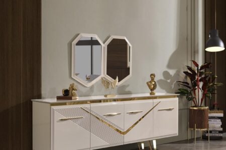 Masa, 6 sandalye, konsol ve ayna.